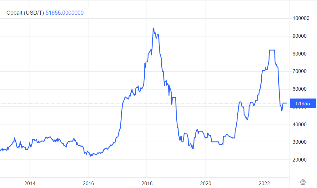 当时,由于对动力电池需求的火热预期,钴的价格从2016年的不到3万美元/吨,一路飙涨至超过9万美元/吨。