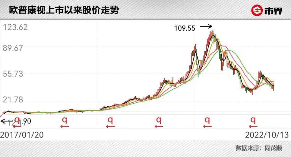 这样的“卖点”也成就了欧普康视,作为国内“OK镜第一股”,欧普康视也是第一个获得国产OK镜牌照的公司。其更是凭借高单价、高毛利、一年一换的高复购率模式,助其股价在4年内翻了近5倍,2021年6月底公司市值曾触及967亿元的历史高点,被称为“眼科茅台”。