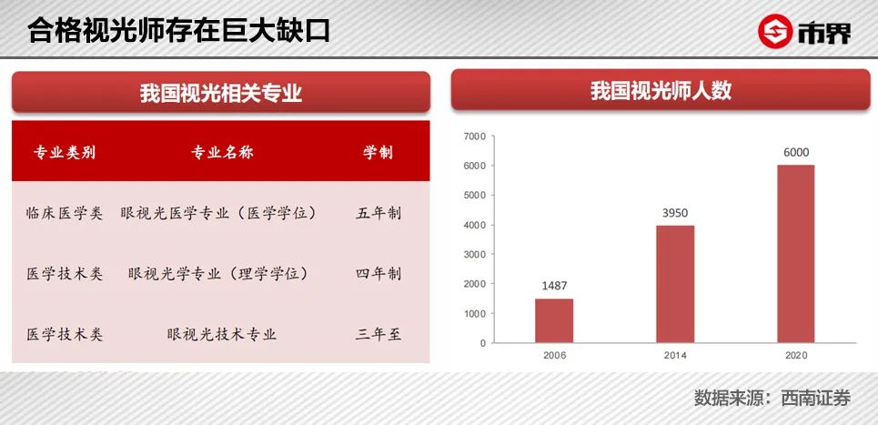 根据西南证券研报,2020年我国视光师约为6000多人,尚无法满足相应现有的视光服务需求。美国每1位视光师对应2553位近视患者,如果对标美国,我国视光师缺口为23万。据统计,美国85%的基层眼保健服务是视光师(OD)提供的。