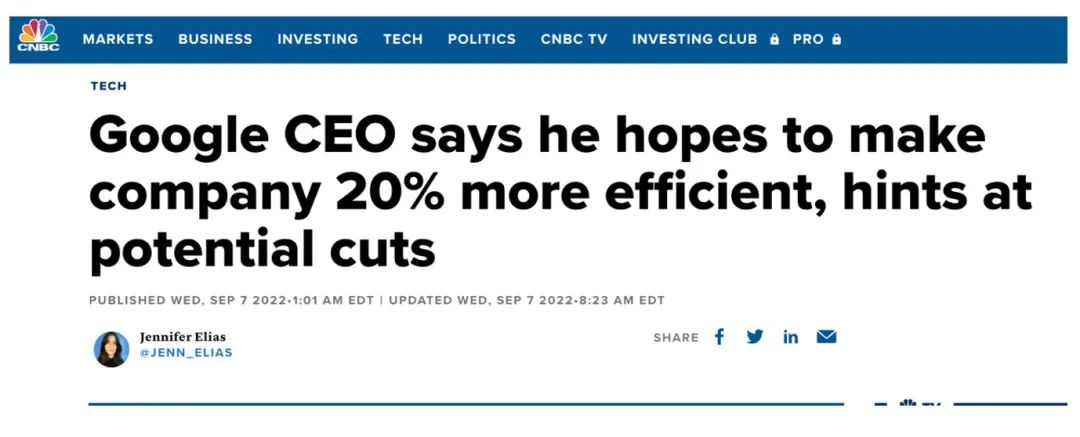 在上月中旬的谷歌Code Conference大会上,谷歌CEO Pichai公开表示面对经济不确定性加剧和广告收入的放缓,他希望将公司的效率提高20%。讲话中他提到了两个关键问题,一是在员工人数激增后,公司效率已经变得“更慢”;二是谷歌正在采取一些措施提高效率,列举了过去把 YouTube Music 和 Google Play Music 整合到一个产品中的例子,暗示着将进行部门整合。