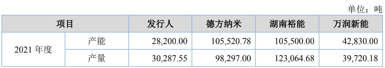 另据招股书披露,2021年公司磷酸铁锂产能为28200吨,而德方纳米、湖南裕能、万润新能的产能分别为1105520.78吨、105500吨和42830吨。