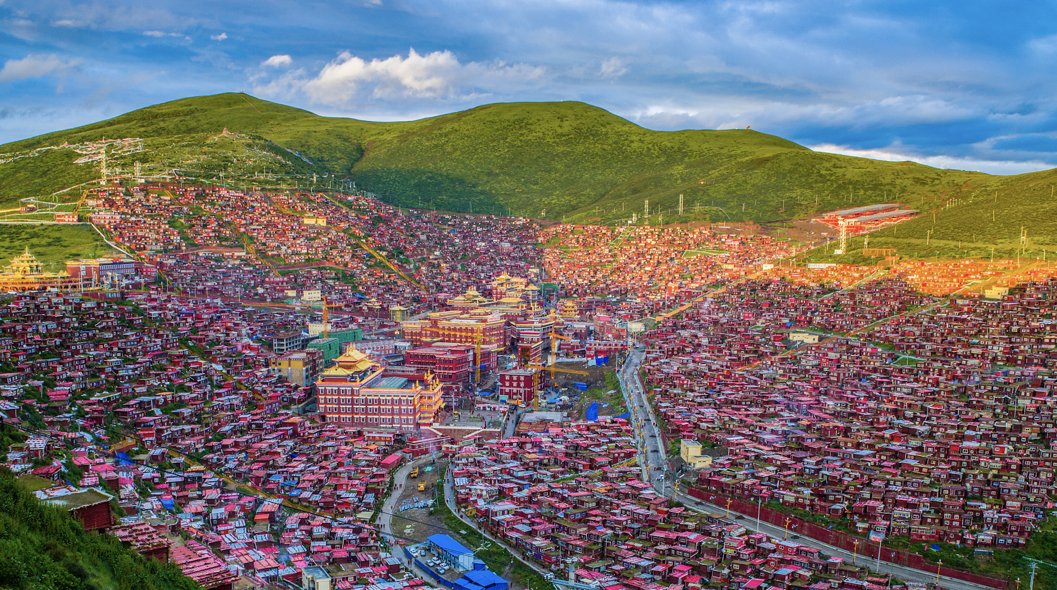 无论从什么角度看,色达似乎都符合年轻人对于超越现实的想象。这里远离世俗职场,平均海拔4127米,离最近的机场也有400多公里;这里有烟火和颜色,僧侣们从1980年铺起来的屋舍,成为了一望无际的红。