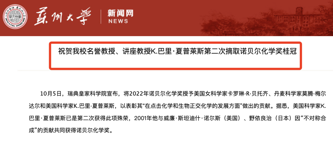与其他名誉/荣誉教授不一样的是,苏州大学和夏普莱斯的关系显得更为紧密。夏普莱斯除了是苏州大学的名誉教授之外,还是讲座教授。苏州大学在喜报中称“我校名誉教授、讲座教授K.巴里·夏普莱斯第二次摘取诺贝尔化学奖桂冠。”
