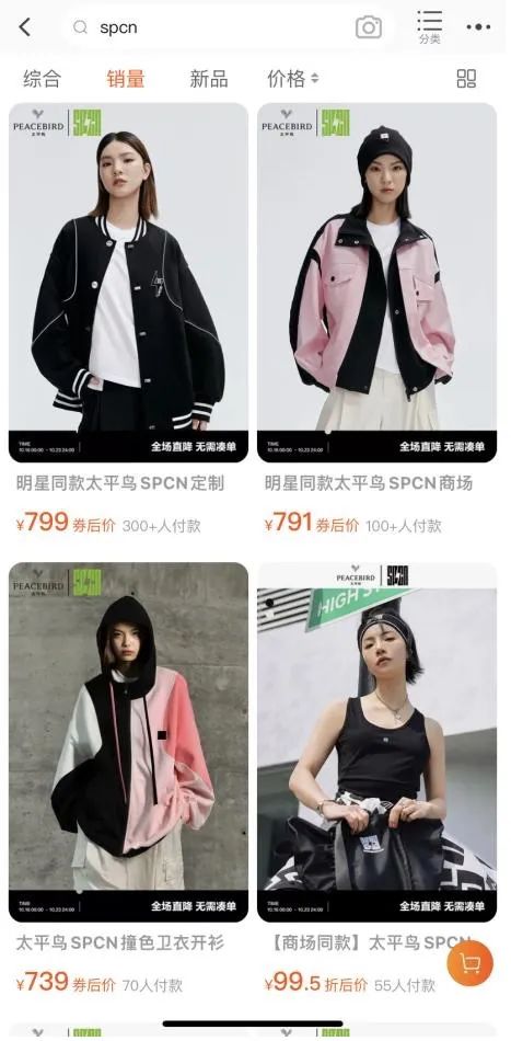 仅从淘宝太平鸟官方旗舰店销量来看,SPCN系列销量并不高,其中,销量最高的一款月销仅300+。