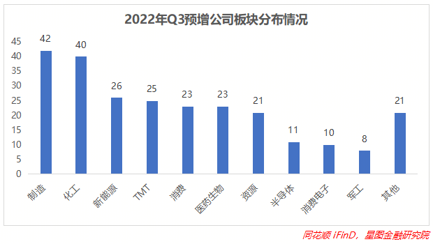 从行业数量来看,制造业中业绩预增的公司数量最多,达42家,在预增公司中占比16.8%,这与我国制造业大国的地位相符,同时也可以反映出三季度制造业的回暖向好;化工行业次之,有40家,随后是新能源行业26家,TMT板块25家,消费23家,医药生物23家,资源行业21家,半导体11家,消费电子10家,军工8家,其余行业公司共21家。