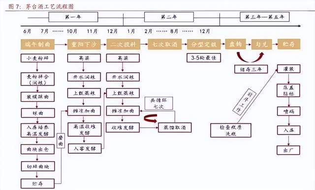 一瓶茅台酒历经五年工艺周期,一年生产,三年陈酿,勾调再经历一年。其中, 一年生产过程包括:端午制曲、重阳两次投料,历经九次蒸煮、八次加曲、七次取酒,故称“12987”生产工艺。每月为一个小发酵周期,蒸馏取酒后将酒糟摊凉添加酒曲后再发酵。七次取得的茅台原酒又按酱香、醇甜和窖底三 种典型体、不同轮次在透气性好的大陶坛里分别存储陈酿至少三年。
