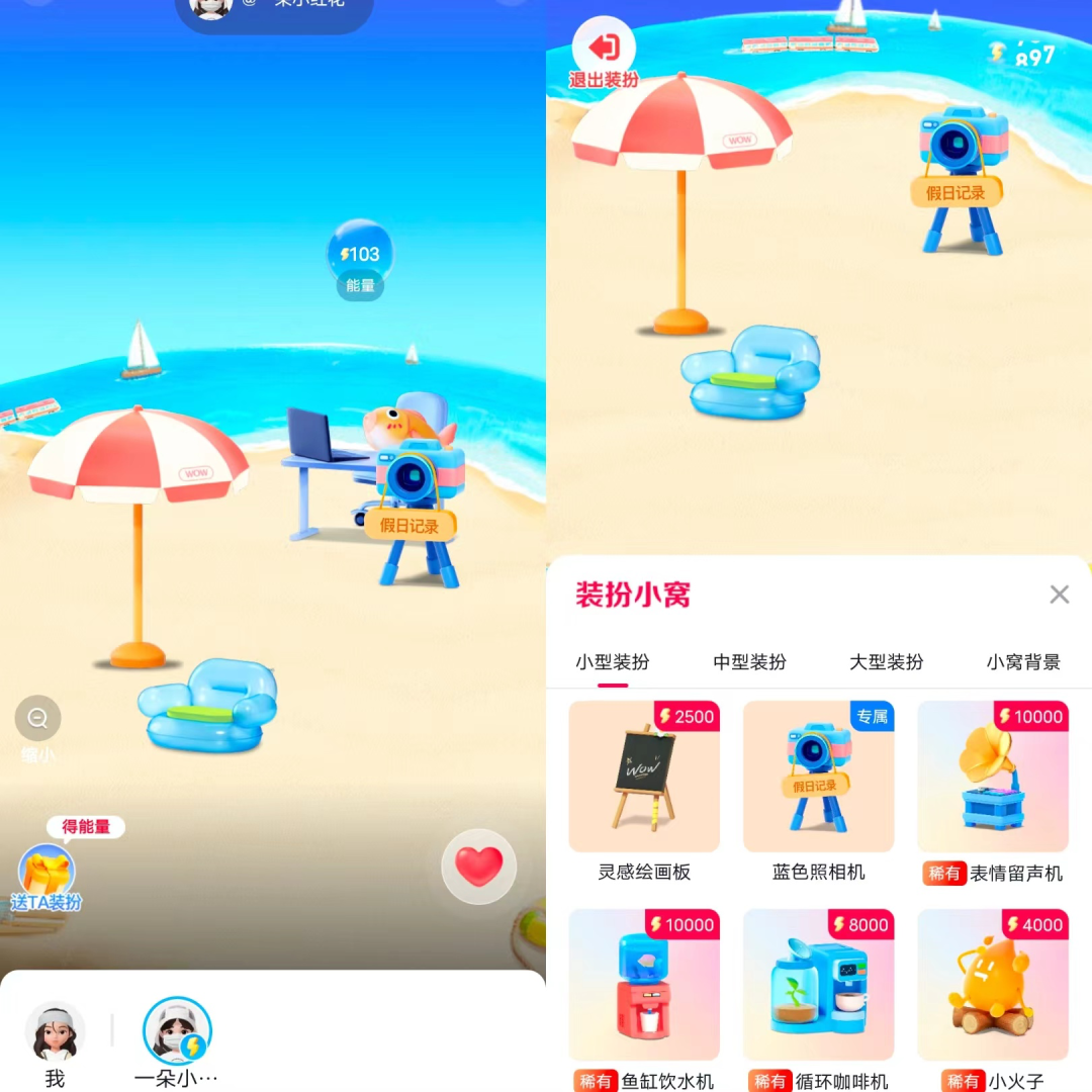 获取能量后,用户可以兑换装饰品,用于装扮小窝,陈设的方式可按照用户的喜好自行搭配,每种装饰品的能量价位并不一样,稀有款的价格会更高,这就需要用户更多参与小窝的任务,以及提高社交频率,获取大量能量。