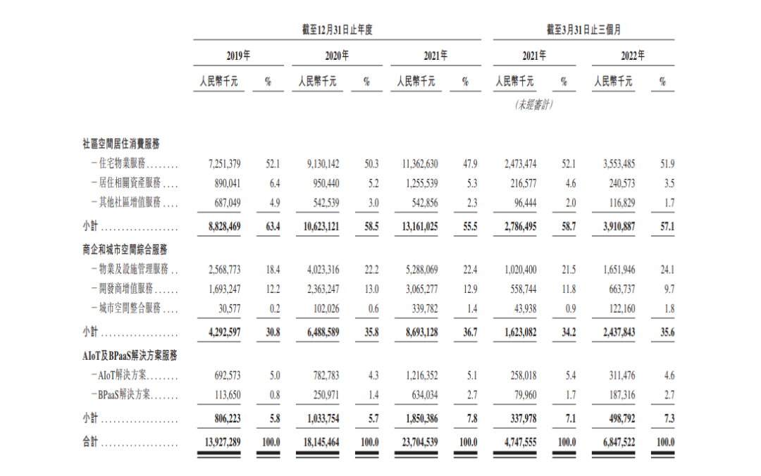 据招股说明书显示,2019年至2021年万物云分别实现营业收入139.27亿元、181.45亿元、237.05亿元,其中社区空间居住消费服务三年间实现营业收入分别占营业总收入比重为63.4%、58.5%、55.5%,是万物云的业绩主力;商企和城市空间综合服务三年间实现营业收入分别占营业总收入比重为30.8%、35.8%、36.7%,业绩贡献也十分可观;而“云含量”最高的AIoT及BPaaS解決方案服务三年间实现营业收入分别占营业总收入比重却仅为5.8%、5.7%、7.8%,尚未起到支撑作用。