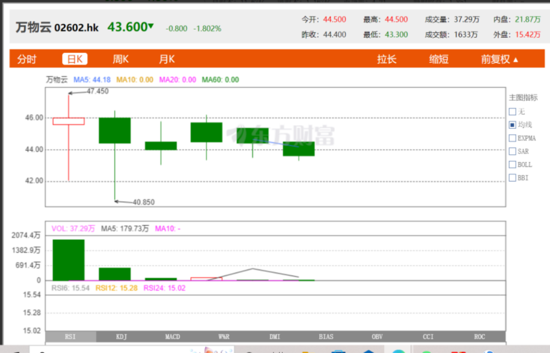 截至上市当日收盘,万物云股价为46港元/股,较发行价49.35港元下跌6.79%,当日破发,总市值约为544.9亿港元。 10月10日,万物云以38.16元收盘,相比上一个交易日下跌3.21%,万物云股价已连续3日下跌。