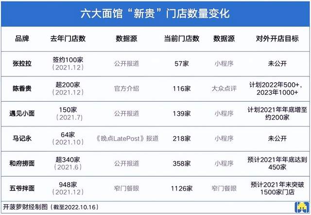开菠萝财经结合品牌官方微信小程序、大众点评、第三方查询平台,得出一组数据,张拉拉、陈香贵、遇见小面、马记永、和府捞面和五爷拌面,当前的全国门店数分别是57家、116家、139家、218家、358家、1126家。