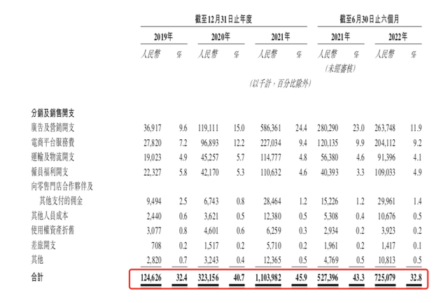 近几年,不仅蕉下的营销费用大幅攀升,而且相比于同期营收的增长,营销增幅甚至更快。招股书显示,蕉下2020年、2021年的营收同比增长为106%、203%,但广告及营销开支的增速则分别高达222%、392%,挣钱速度赶不上花钱速度。