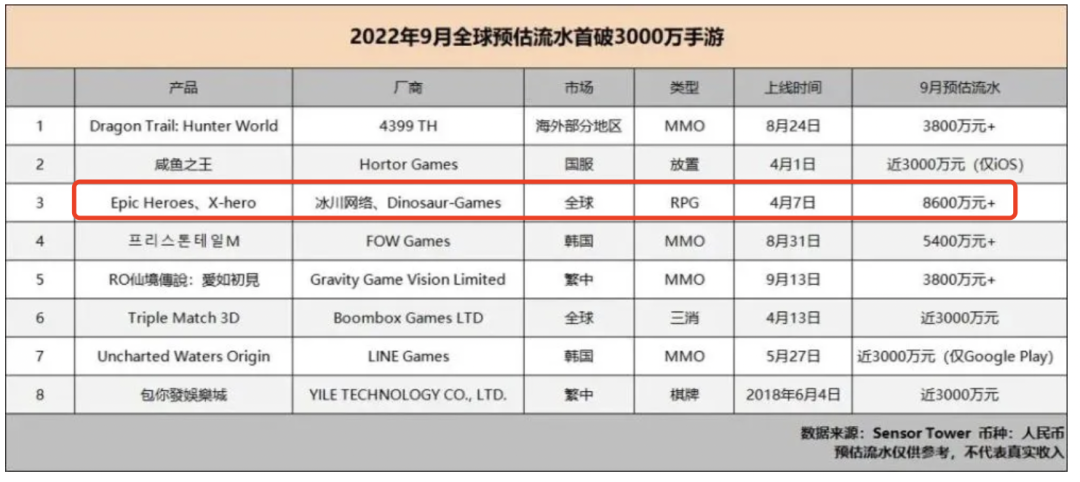 《X-Hero》在《拯救狗狗》玩法推出后,该游戏成绩迎来了彻底爆发,今年9月份营收预估高达8600万元。(PS:《X-Hero》是《Epic Heroes》的安卓版本)