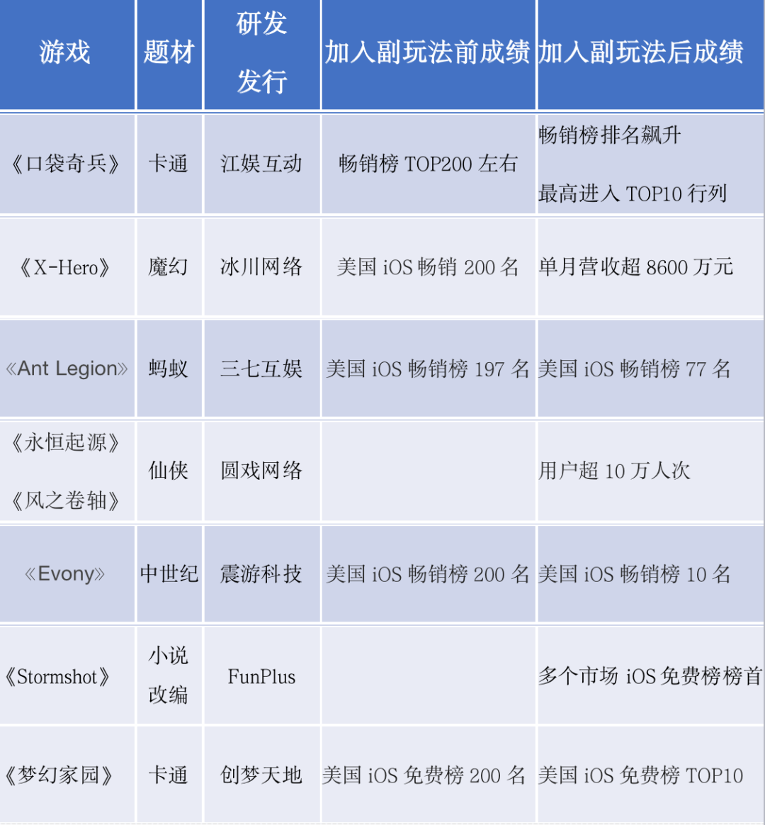根据DataEye研究院不完全统计,《口袋奇兵》、《X-hero》、《Ant Legion》、《永恒起源》、《风之卷轴》、《Evony》、《Stormshot》、《梦幻家园》等产品都有在主玩法之中加入副玩法体验,并且加入之后成绩有显著提升。