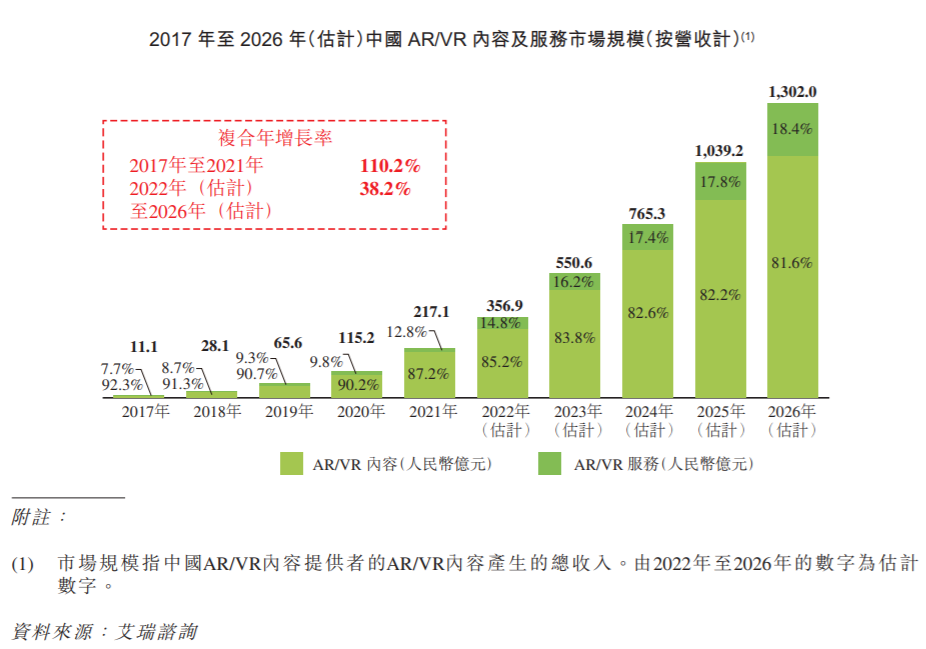 根据艾瑞咨询的数据,按收入计,AR/VR内容及服务市场的市场规模从2017年的人民币11.1亿元增长至2021年的人民币217.1亿元,复合年增长率达110.2%。