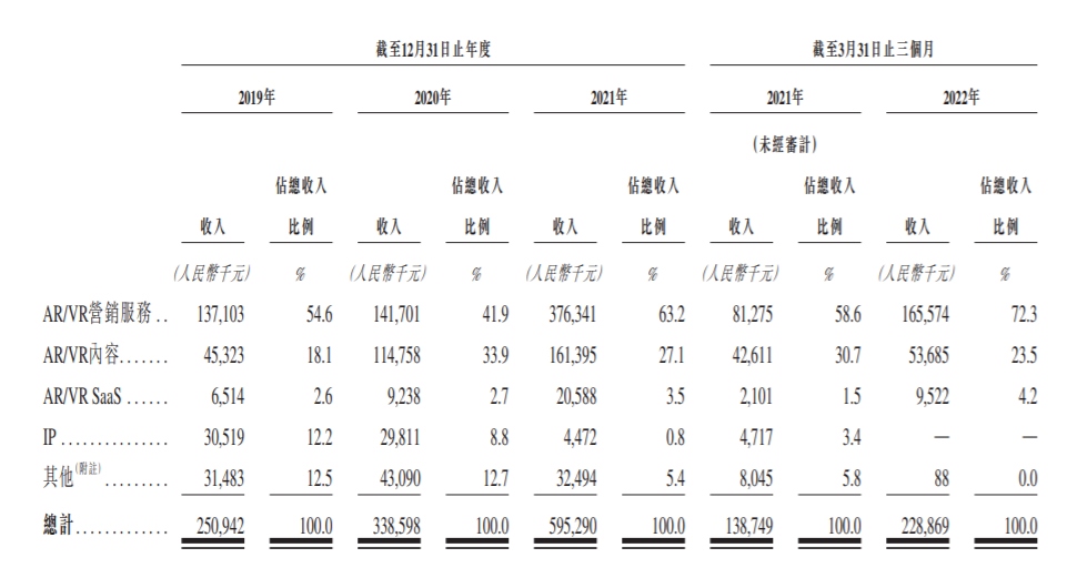 其AR/VR营销服务在报告期内的营收分别为 1.37亿元、1.42亿元、3.76亿元,营收占比54.6%、41.9%、63.2%;AR/VR内容在报告期内的营收分别为4532.3万元、1.15亿元、1.61亿元,营收占比18.1%、33.9%、27.1%。