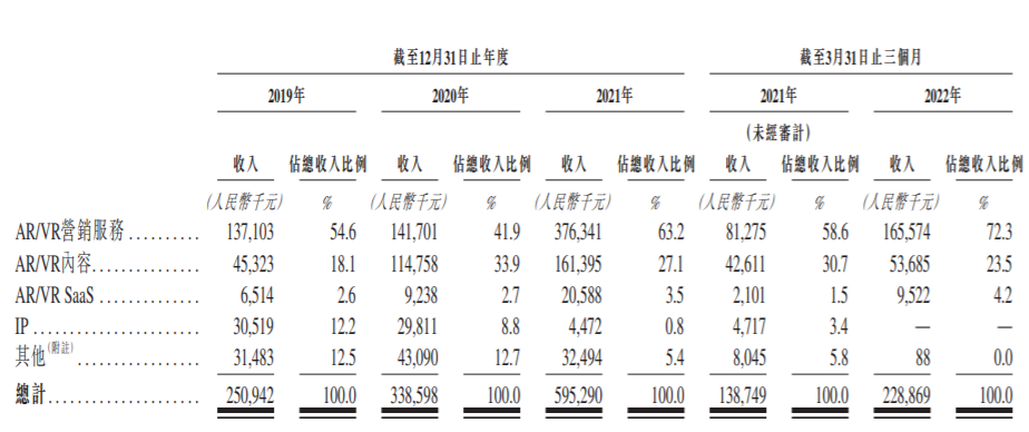 时至今日,改名为后的飞天云动已经完全将自己的主营业务进行了转型与优化,根据《招股书》,目前飞天云动的主营业务分为四项: AR/VR营销服务、AR/VR内容、AR/VR SaaS与IP业务。