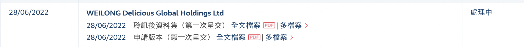 经派财经翻看香港交易所官网公告,2022年6月28日递交的卫龙控股申请书及聆讯后资料已经通过,显示正在处理中。