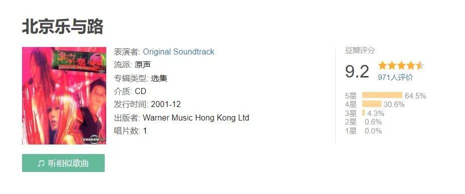 早在千禧年初,摇滚电影《北京乐与路》上映,这部电影在豆瓣上的评分为7.2,好于80%的音乐片。而在电影原声音乐的表现力,这部电影显然优秀得多。电影选择子曰乐队来独挑大梁,除了子曰乐队的《磁器》、《光的深处》等贴合主角形象的摇滚乐作品,电影也做了许多贴合剧情的优秀原声配乐,诸如《回忆之前,忘记之后》、《北京乐与路》等,大胆地运用了二胡等民乐。最终,这张原声专辑在豆瓣上获得了9.2的评分。