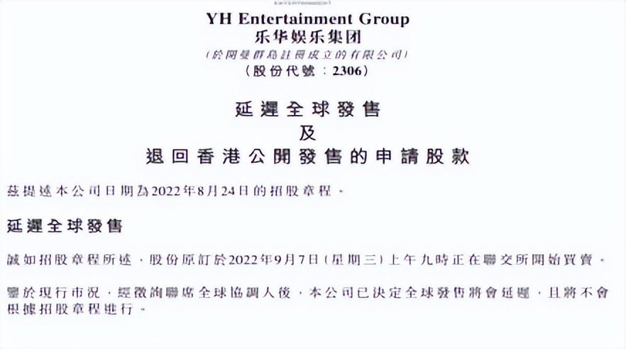 无独有偶,被视为“王一博概念股”的乐华娱乐在9月2日公告暂缓上市,“鉴于现行市况,经征询联席全球协调人后,本公司已决定全球发售将会延迟,且将不会根据招股章程进行。”