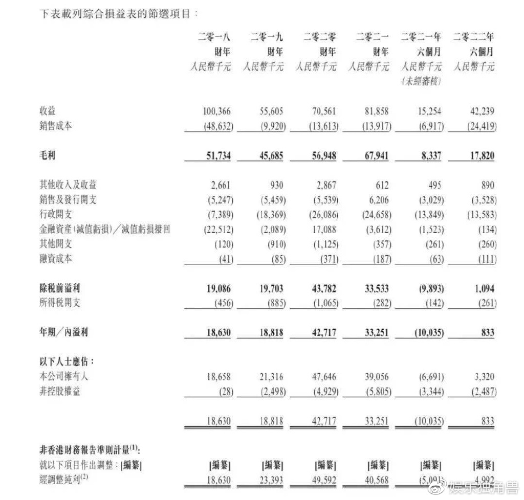 据灼识咨询报告,按2021年中国音乐版权许可及音乐录制产生的收益计,风华秋实在400多家音乐唱片公司中排名第15位,市场份额约为0.6%。招股书显示,受疫情影响,风华秋实演唱会主办和制作业务大幅缩水,公司音乐艺人于 2020 至 2021 财年原定举行的实体演唱会已全数取消。今年上半年,公司营收4223.9万元,溢利仅83.3万元。其营收主要来自音乐授权,与鹿晗的独家音乐合约从2015年持续至2024年,距离届满还剩3年。招股书中,鹿晗的名字被提及超200次。