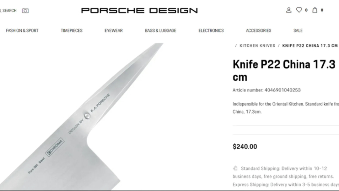 除了法拉利因卖高级服饰登上热搜,另一大高端车企品牌保时捷最近也因为“1700元一把的菜刀”而被顶上热搜。据保时捷设计官网介绍,这是一把不锈钢的一体式中国菜刀,售价240美元(折合人民币1700元)。这把菜刀唯一的装饰就是手柄前端刻印有“纯301钢,由保时捷设计”的字样。