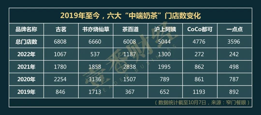 截至2022年10月7日,中端奶茶市场的六大品牌古茗、书亦烧仙草、茶百道、沪上阿姨、CoCo都可、1点点的门店数及近些年变化情况如下: