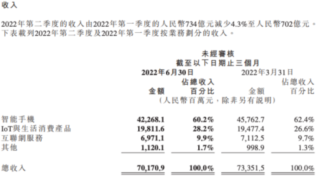 最新一个季度的财报显示,小米集团2022年上半年收入1435亿元,同比下降12.8%,经调整利润49.4亿元,同比减少60%。第二季度收入为702亿元,同比下降20%,经调整利润20.8亿元,同比下降67%。