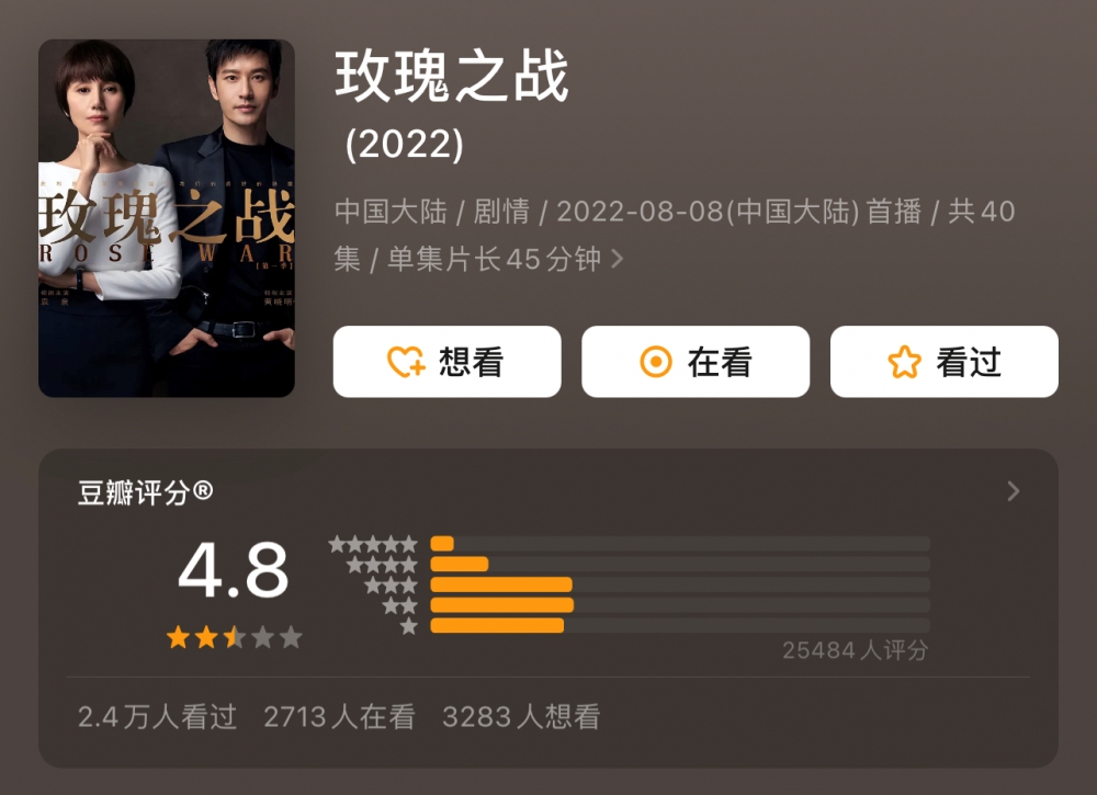 就拿最近的《玫瑰之战》来说。剧的开始,有一段丰盛(黄晓明饰)带着顾念(袁泉饰)去办公区的长镜头,这个镜头也存在于《傲骨贤妻》,无论是从镜头调度还是说话语速,《玫瑰之战》都输得非常彻底。