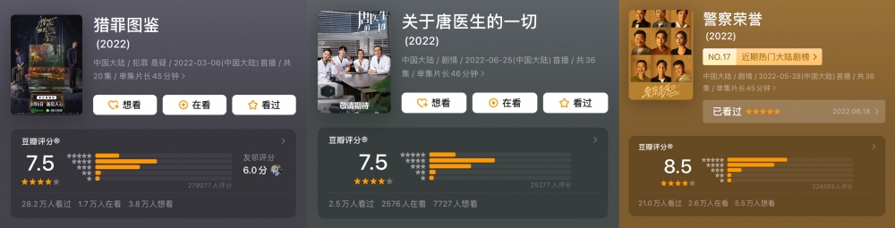 往近了看,《猎罪图鉴》、《关于唐医生的一切》、《警察荣誉》,都算是国产职业剧口碑、收视双收的作品。