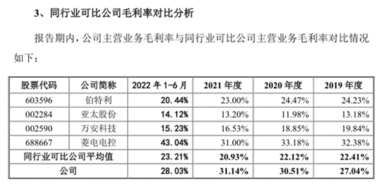 2019年-2021年和2022年1-6月(下称“报告期”),元丰电控分别实现营业收入35470.52万元、45816.9万元、45799.18万元、24204.67万元,净利润分别为3980.43万元、6598.82万元、6735.25万元、3170.85万元,其中2021年元丰电控的营收同比下降0.04%,净利润同比上升2.07%。钛媒体APP注意到,元丰电控2021年之所以出现降收增利主要是因为毛利率,报告期内,元丰电控的毛利率分别为毛利率分别为27.04%、30.51%、31.14%、28.03%,同行业可比公司平均值分别为22.41%、22.12%、20.93%、23.21%。也就是说,元丰电控的毛利率持续上升,且始终远高于同行业可比公司平均值。