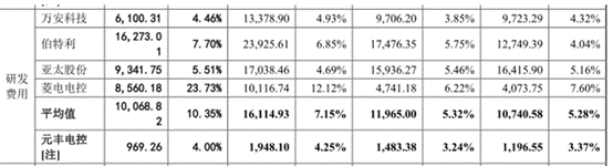 值得一提的是,报告期内,元丰电控研发费用率分别为3.37%、3.24%、4.25%、4%,同行业可比公司平均值分别为5.28%、5.32%、7.15%、10.35%。元丰电控到底是如何在研发费用率始终低于同行业可比公司平均值的情况下,其毛利率却始终能远高于同行均值?