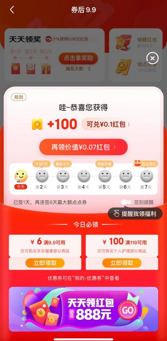 同时,在如何维持消费者的购买热情方面,不少平台正在尝试不同的玩法探索。京东在券后9块9专区中设置了签到兑换金币和优惠券的功能,连续签到七天奖励会随之增加。这种方式能够保持消费者对特价专区的关注度,也能让商品获得更长的曝光时间。
