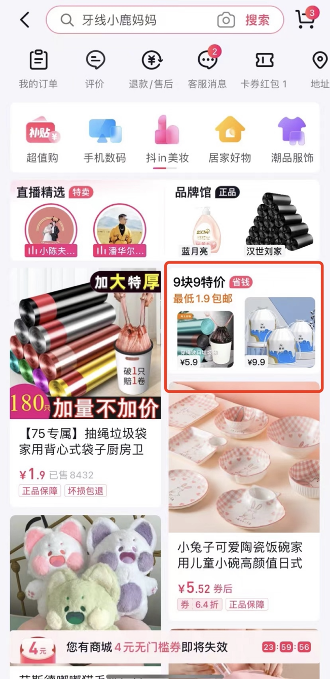 豆豆提到的其实是抖音极速版最新推出的“9块9特价”新频道,这一频道内嵌在抖音极速版的商城中,分为4.9元专区、9.9元专区以及爆款专区,覆盖了家居日用、个护家清等日常需求量大的商品品类。