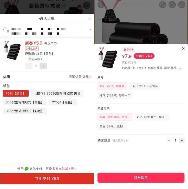 “最先在薅羊毛的群里面看到别人发的抖音极速版的商品链接,点进去是垃圾袋。”豆豆称,纸巾、口罩、垃圾袋、洗衣液是她经常比价购买的商品,这些商品的共同特点就是日常生活中的需求量非常大,她在购买之前就常常游走在多个平台上进行比较。“抖音极速版现在正好在活动期间,叠加优惠券之后,那款垃圾袋5卷价格是4.9,我顺手去拼多多上一搜,也找到了同一家店的同一件商品,5卷的标价是5.9。”