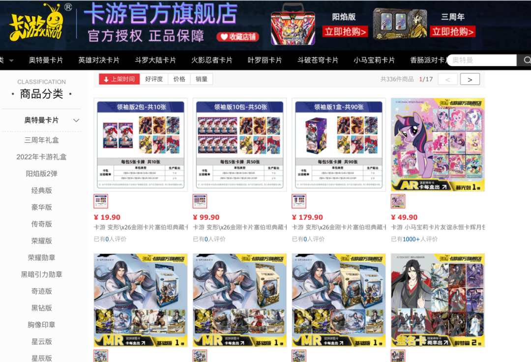 卡游官方旗舰店里的卡牌产品矩阵,囊括了多个知名IP / 京东