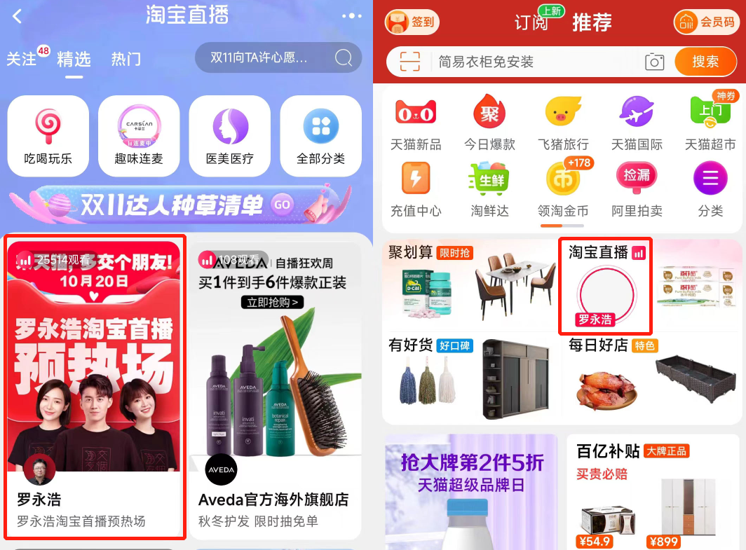 网传,此次合作商家的合作费用是单坑20万,打包权益60万,打包权益包括坑位费以及一定时间的切片和肖像使用授权、公众号发文。淘宝直播也将在直播当天给到5000万UV的扶持。新榜编辑部观察发现,开播不久,“罗永浩”直播间就出现在了淘宝的多个推荐位。