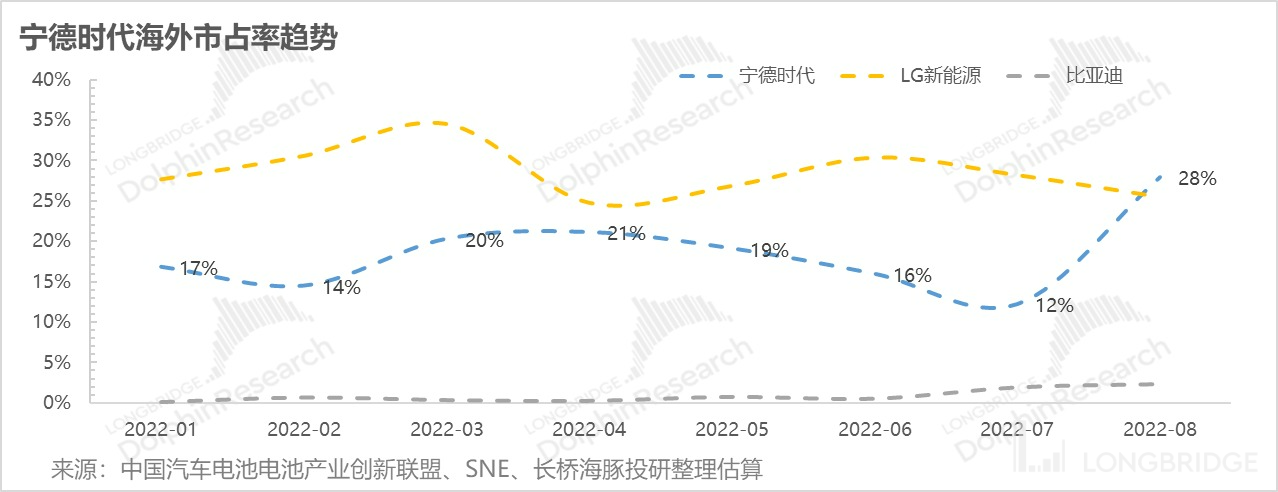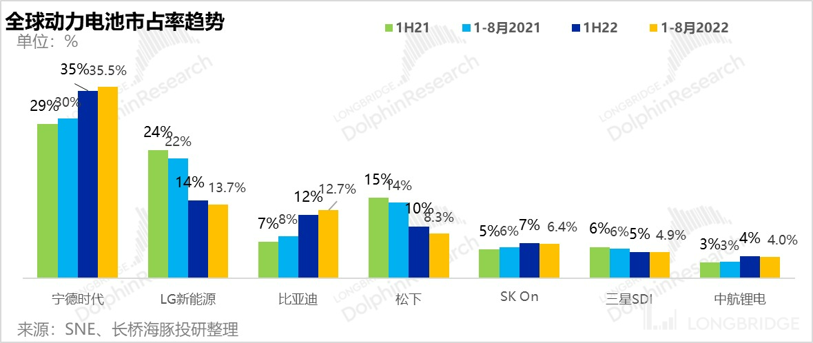 而从全球来看,7、8 月份国内电池厂还在进一步侵蚀 LG 新能源、松下等等公司的市场份额,宁德时代今年 1-8 月的市场份额是 35.5%,比上半年的 35% 有进一步的提升。