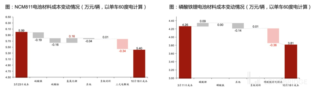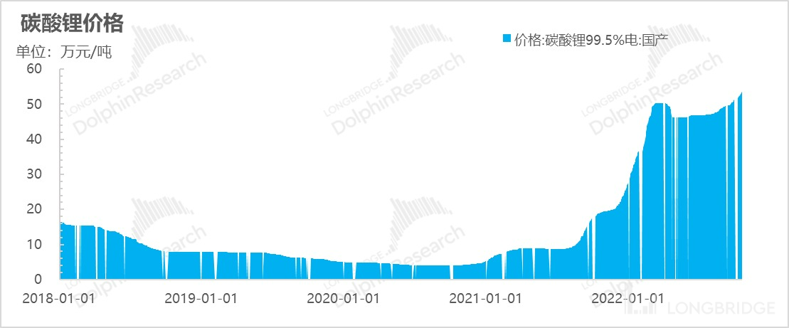 虽然当前其他材料,譬如三元前躯体、电解液、六氟磷酸锂等相比之前的价格顶点都有-20% 到-50% 的下行,但锂价的高位甚至上升趋势把其他的降价效果大打折扣。