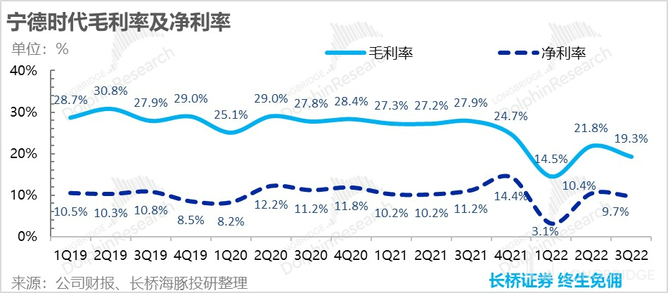 2. 毛利率又不行了?由于之前已提前预告了超高的归母利润,实际的收入比利润更加霸气,所以这次答卷核心拉胯的地方就出在了市场最为关心的毛利率上:本来由于三季度顺价完成,锂的价格高位稍有回落,其他非锂电池材料有明显降幅,毛利率不至于比二季度差,但三季度综合 19.3% 的毛利率水准低于上季度的 21.8%,不过宁王解释说主要是因为二季度因价格回溯导致二季度毛利率虚高了一些(具体解释见正文),实际三季度无论是动力电池还是储能,环比都是改善的。