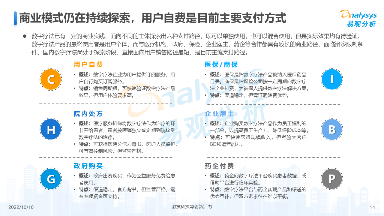 目前,数字疗法仍处于初期发展阶段,相关监管措施和行业标准并不完善,但市场整体呈现出增速快、适应症丰富、入局者多样的特点。适用于不同病种的数字疗法发展进程不一,其中精神神经类由于治疗周期较长、措施丰富、无创治疗等治疗特点,更适应数字疗法的转换,因此市面上产品也较为丰富。支付方式上,主要有用户自费、院内处方、政府购买、医保/商保、企业雇主、药企付费六种,用户自费由于商业路径更短、限制条件更少而成为目前主要支付方式,其他商业模式仍在持续探索中。