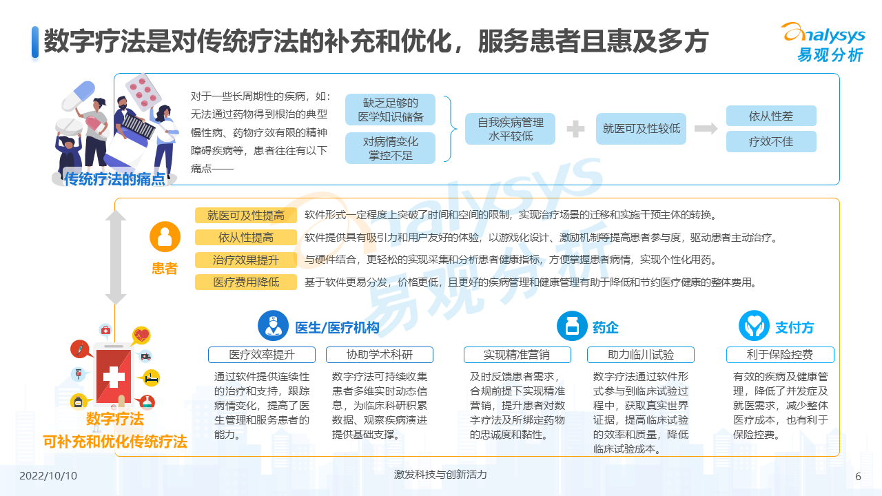 数字疗法是传统疗法的补充和优化,孕育于现代化数字技术的土壤,在服务患者的同时惠及医生、医疗机构、药企和支付方,随着社会整体健康意识的提升,市场正在加速培育。
