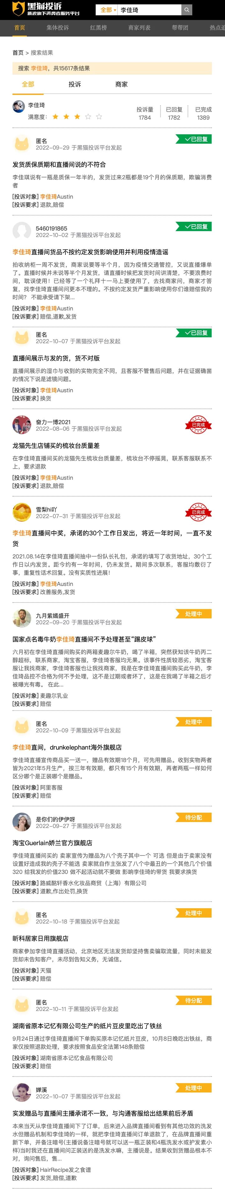 10月22日搜索“李佳琦”共有15617条结果,几乎涵盖了李佳琦直播带货过的所有品类,3C、数码、家电、美妆等品类较为突出,涉及“虚假宣传、不履行价保约定、质量问题、未出具真品检测报告、赠品”等多种问题。