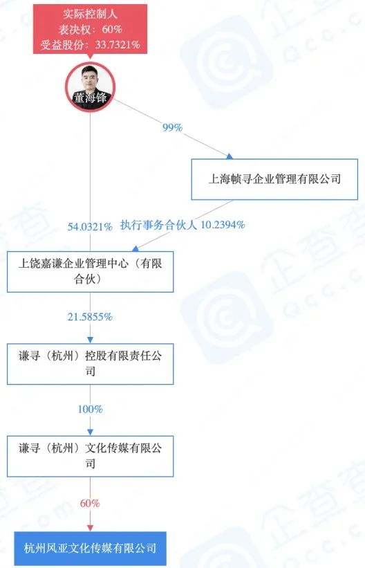 风亚,谐音“锋娅”,仅凭名字就不难推断出其与薇娅夫妇(董海锋、薇娅)的密切关联。企查查显示,谦寻(杭州)文化传媒有限公司持有风亚公司60%股份,薇娅丈夫董海锋间接持有风亚公司33.7%股份,为实际控制人。
