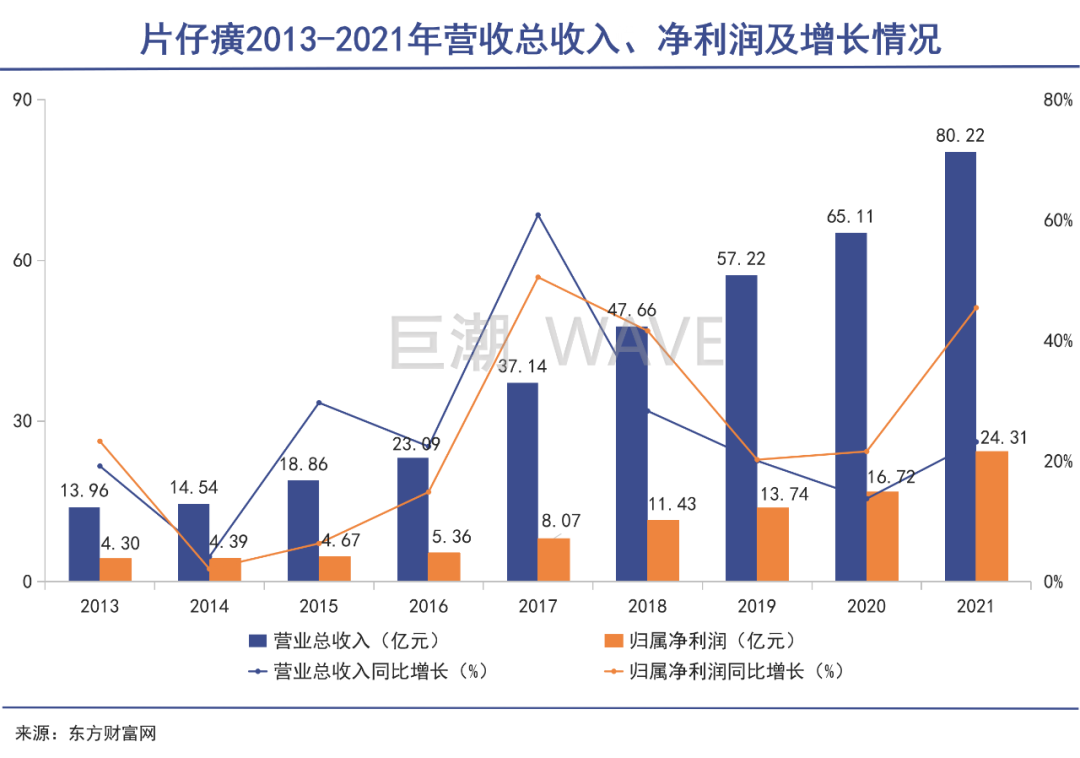 根据东方财富数据显示,过去将近十年间,片仔癀营收增速基本在20%以上,净利润增速也始终保持在20%左右,其中不乏40%、50%以上增速的亮点时刻。