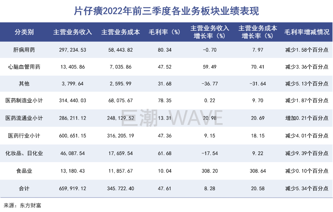 前三季度,片仔癀肝病用药主营业务收入29.72亿元,同比下降0.7%。而在此之前历年的前三季度经营数据中,片仔癀的肝病用药业务增速从来没有低于过30%。这可能是一个会“伤筋动骨”的大问题。