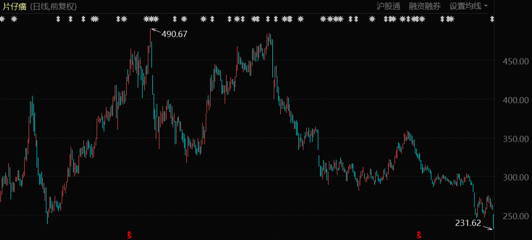 2021年,市面上片仔癀“一粒难求”,在黄牛手中甚至疯涨超3000元一粒,贵过黄金。去年,片仔癀的股价也一口气冲到了490元,市值曾一度高达2966亿元,成为“中药第一股”。