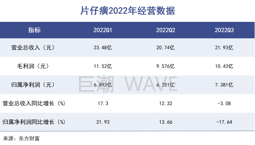 不过2022年成了一个转折。纵观今年整年,片仔癀不仅是三季度业绩乏力,而是业绩持续承压。从数据来看,前三季度,片仔癀各项经营数据持续走低,营收和利润增速基本都在20%以下。
