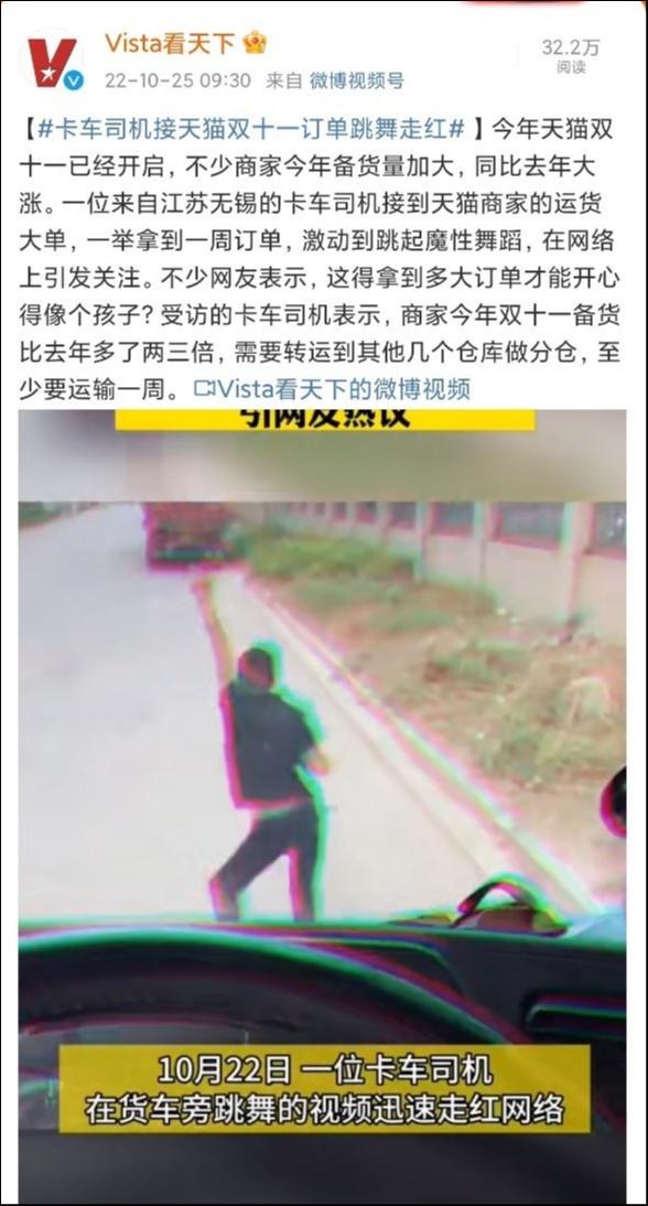 货车司机接到“双11”货运需求跳魔性舞蹈,登上微博热搜