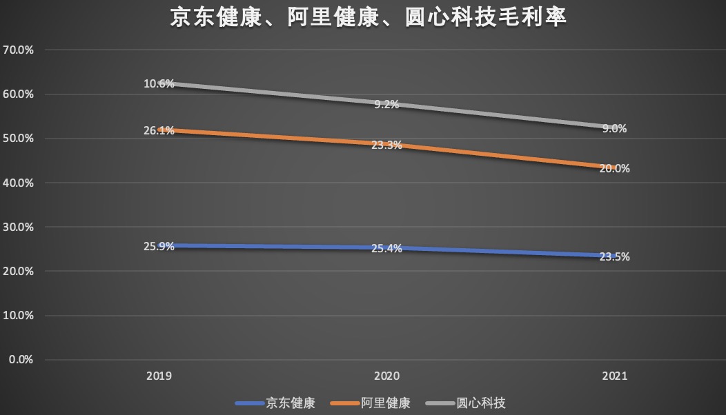 从京东健康、阿里健康和圆心科技毛利率情况来看,圆心科技的毛利率远低于京东健康和阿里健康。
