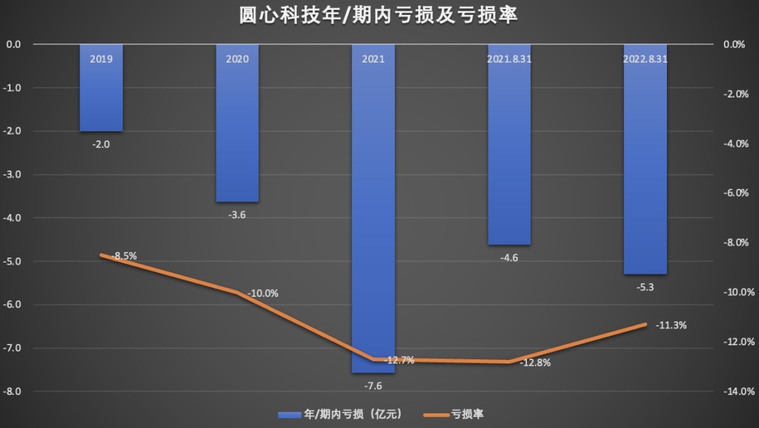圆心科技招股书显示,最近三年圆心科技的亏损在持续扩大。2019年至2021年,圆心科技年内亏损分别为2亿元、3.6亿元和7.6亿元,亏损率分别为-8.5%、10%、-12.7%。2022年前8个月,净亏损高达5.3亿元,亏损率为-11.3%。